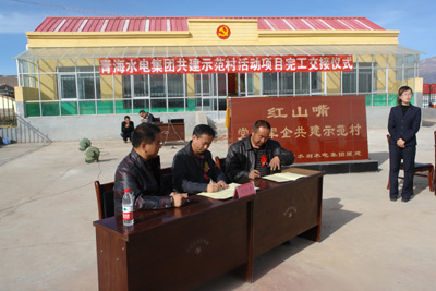 在交接儀式上,董金明書記等領(lǐng)導(dǎo)對聯(lián)建項(xiàng)目給予了高度的評價(jià),并對青海水電集團(tuán)領(lǐng)導(dǎo)多次深入村莊調(diào)查研究、了解村情民意,根據(jù)村莊發(fā)展長遠(yuǎn)規(guī)劃,從實(shí)際需求出發(fā)制定聯(lián)建項(xiàng)目等一系列做法表示崇高的敬意和衷心的感謝。同時(shí),他希望兩村村民借助聯(lián)建的強(qiáng)大動(dòng)力,進(jìn)一步加大改善村容、環(huán)境衛(wèi)生等工作,維護(hù)好、管理好聯(lián)建項(xiàng)目設(shè)施。尹京輝同志在致辭中表示,全縣群眾將永遠(yuǎn)銘記黨和政府的恩情,不辜負(fù)黨和政府給予的各項(xiàng)惠農(nóng)政策,艱苦創(chuàng)業(yè),勤勤懇懇、安居樂業(yè),為建設(shè)社會(huì)主義新農(nóng)村,維護(hù)青海社會(huì)穩(wěn)定,經(jīng)濟(jì)發(fā)展做出貢獻(xiàn)。青海水電集團(tuán)計(jì)劃投資部副部長李宏緒和紅山嘴村代表以及監(jiān)交方青石嘴鎮(zhèn)政府領(lǐng)導(dǎo)簽訂了交接協(xié)議書。村民代表向青海水電集團(tuán)贈(zèng)送了致謝錦旗。