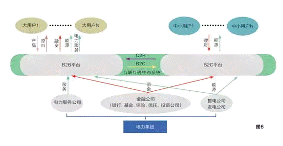 為充分利用互聯(lián)網(wǎng)的零距離、零時差的資源共享優(yōu)勢,在建立中小電力用戶的B2C平臺以及與大用戶之間的B2B平臺后,通過C2B對兩個平臺進行融合,以金融為核心,以供應鏈為紐帶,以能源服務為支持,構建融合多產(chǎn)業(yè)的互聯(lián)互通生態(tài)系統(tǒng)。(見圖6)