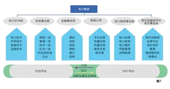 以發(fā)電業(yè)務為基礎,以金融業(yè)務為核心,以電力營銷為龍頭,以電力科研和電力服務為支撐,構建全球化互聯(lián)互通生態(tài)系統(tǒng)。(見圖7)